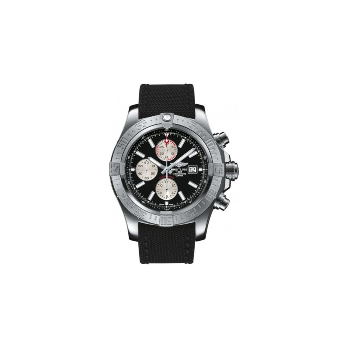 Breitling Super Avenger II / orologio uomo / quadrante nero volcano / cassa acciaio / cinturino military nero
