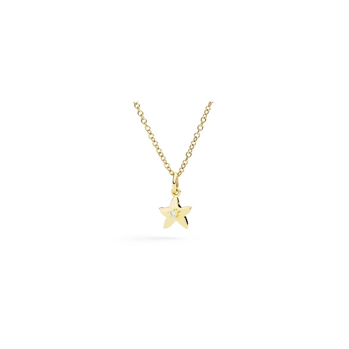 Ciondolo a forma di stella in oro giallo 9k con 1 diamante bianco (0,03 ct). Cordoncino nero incluso.Forse perché è una stella, il tuo desiderio si è appena avverato. Preparati a innamorarti di un gioiello pensato per brillare di una luce inconfondibile: la tua.