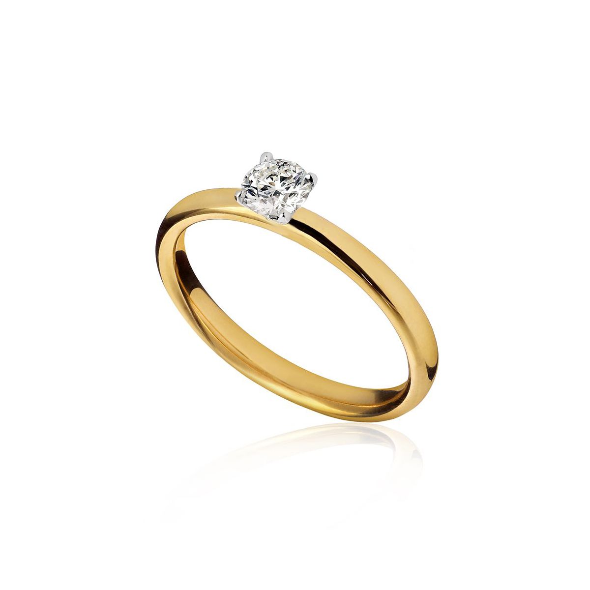 Solitario in oro giallo 18 carati e griffe in oro bianco con diamante centrale taglio brillante.