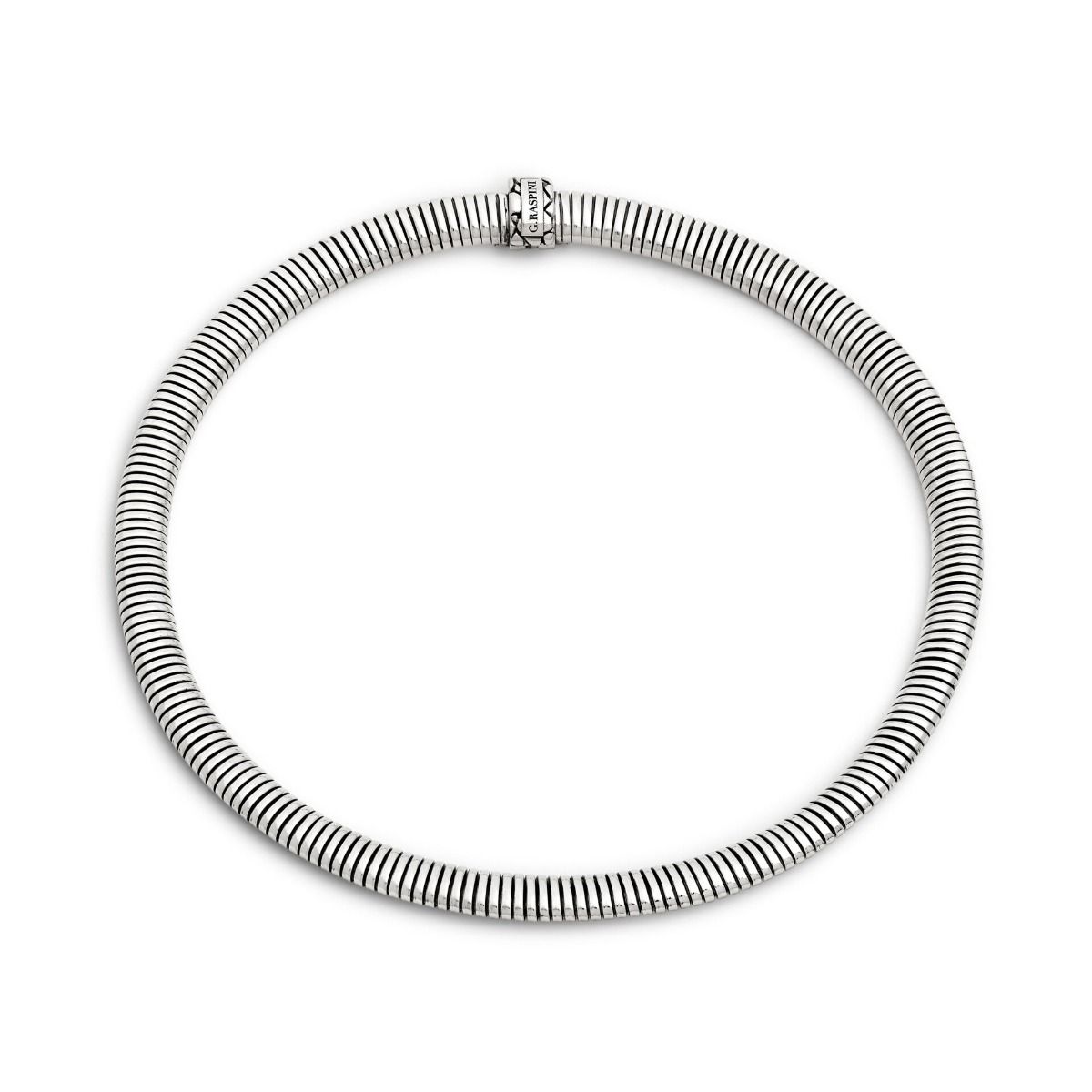 Icona senza tempo della gioielleria, questa collana in argento con maglia tubogas dal design contemporaneo si adagia con naturale eleganza sul décolleté, accompagnando ogni movimento con armonia e luce. La struttura continua esprime equilibrio e armonia, mentre la chiusura diventa un prezioso elemento decorativo, caratterizzato dall’inconfondibile texture croco e impreziosito dal logo Giovanni Raspini. Un gioiello dal carattere deciso e sofisticato, interamente realizzato a mano in azienda.
