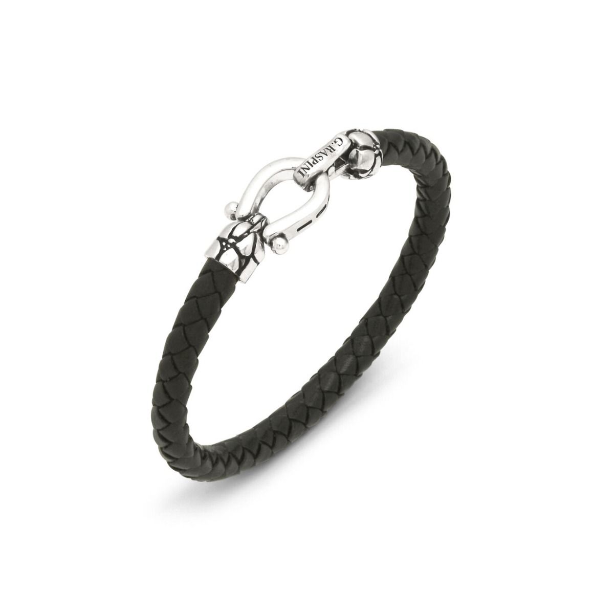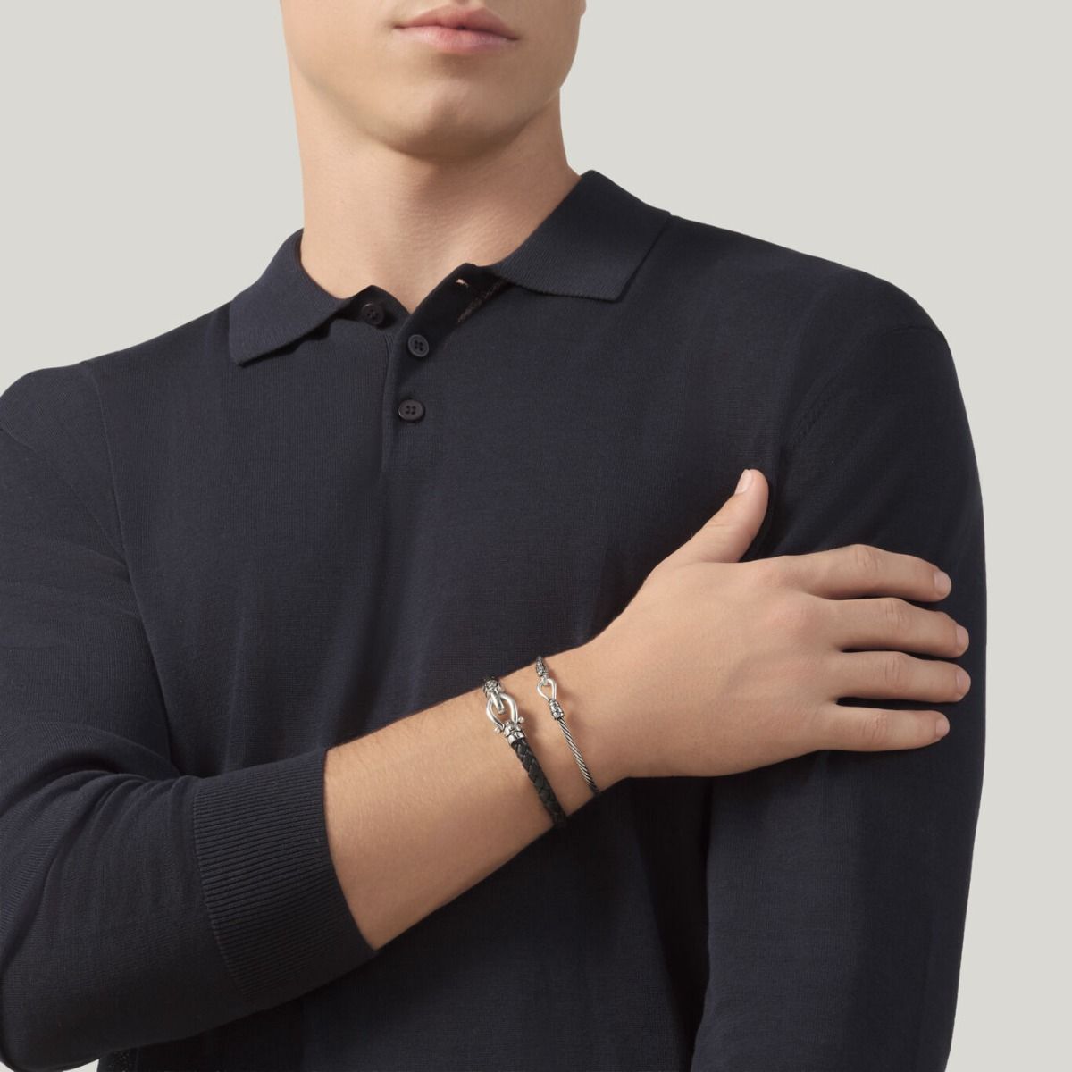 Un bracciale in pelle nera intrecciata che esprime con forza e raffinatezza l’anima maschile del brand. La texture materica, intensa ed elegante, dialoga con la chiusura in argento, elemento funzionale e distintivo al tempo stesso. I due cappucci decorativi, impreziositi dalla texture croco e realizzati anch’essi in argento, completano il design con un segno deciso e sofisticato.