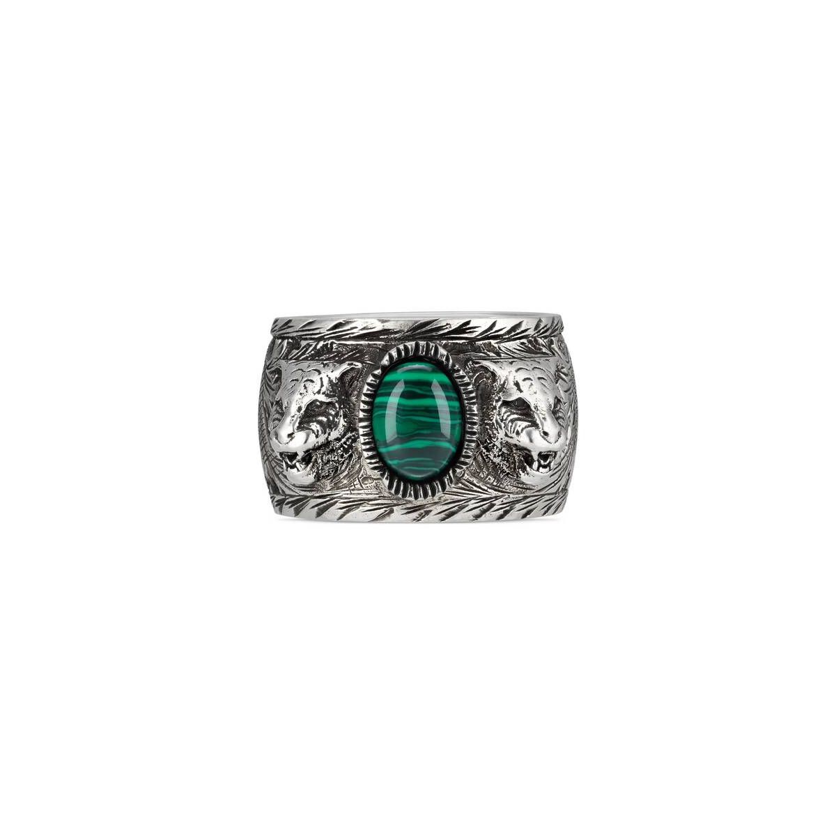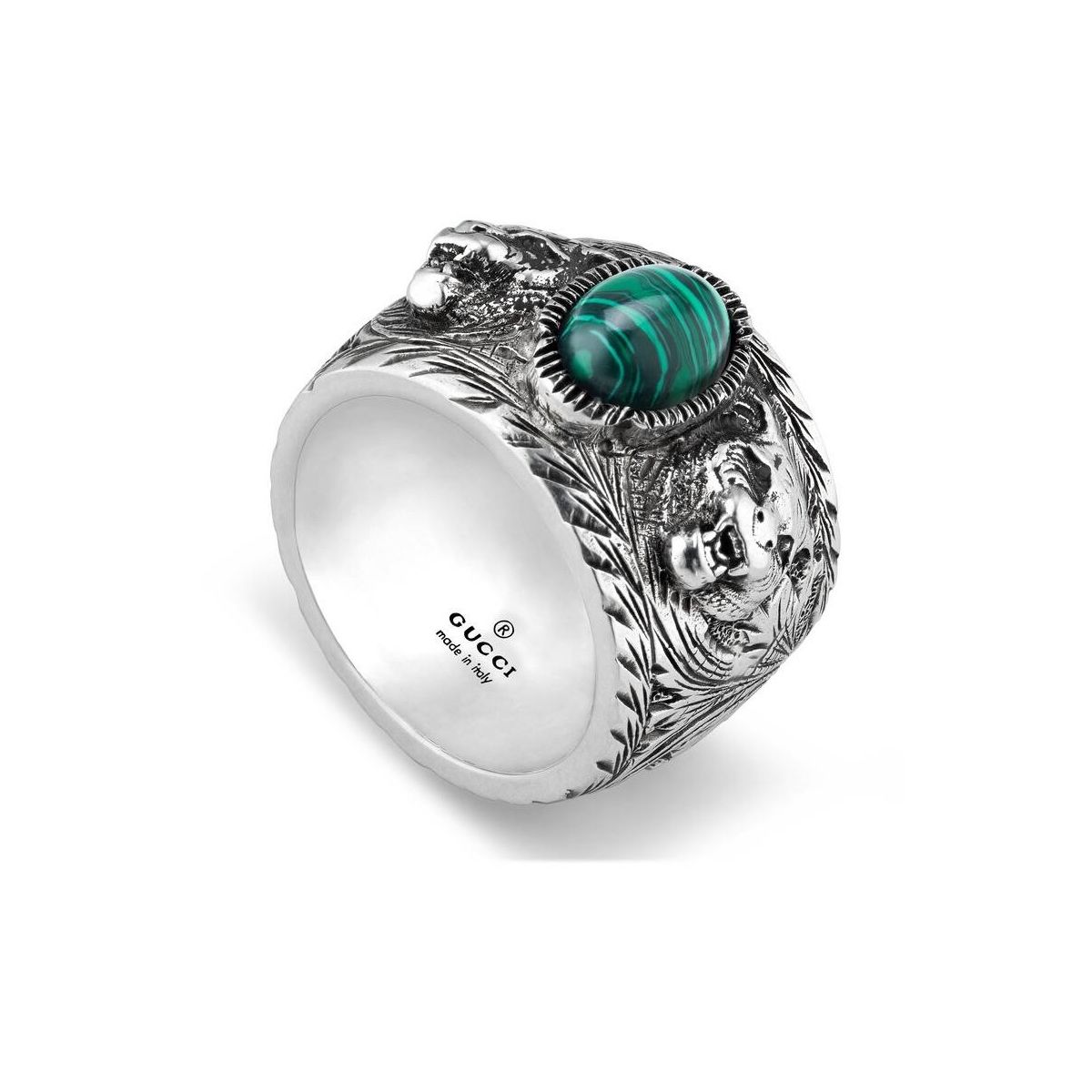 Anello in argento 925 con dettaglio felino ed elaborati motivi incisi ispirati al Gucci Garden, impreziosito da una pietra centrale verde. Nato dalla passione di Alessandro Michele per la bellezza fisica e spirituale della natura, il Gucci Garden è inesauribile fonte di ispirazione per la Maison.