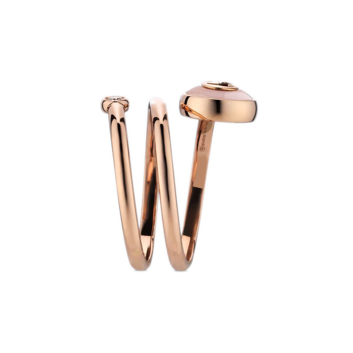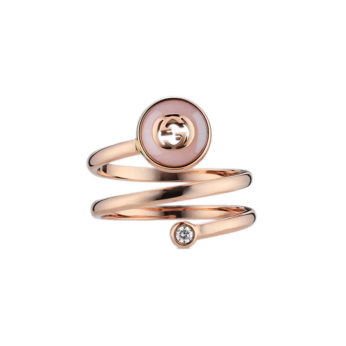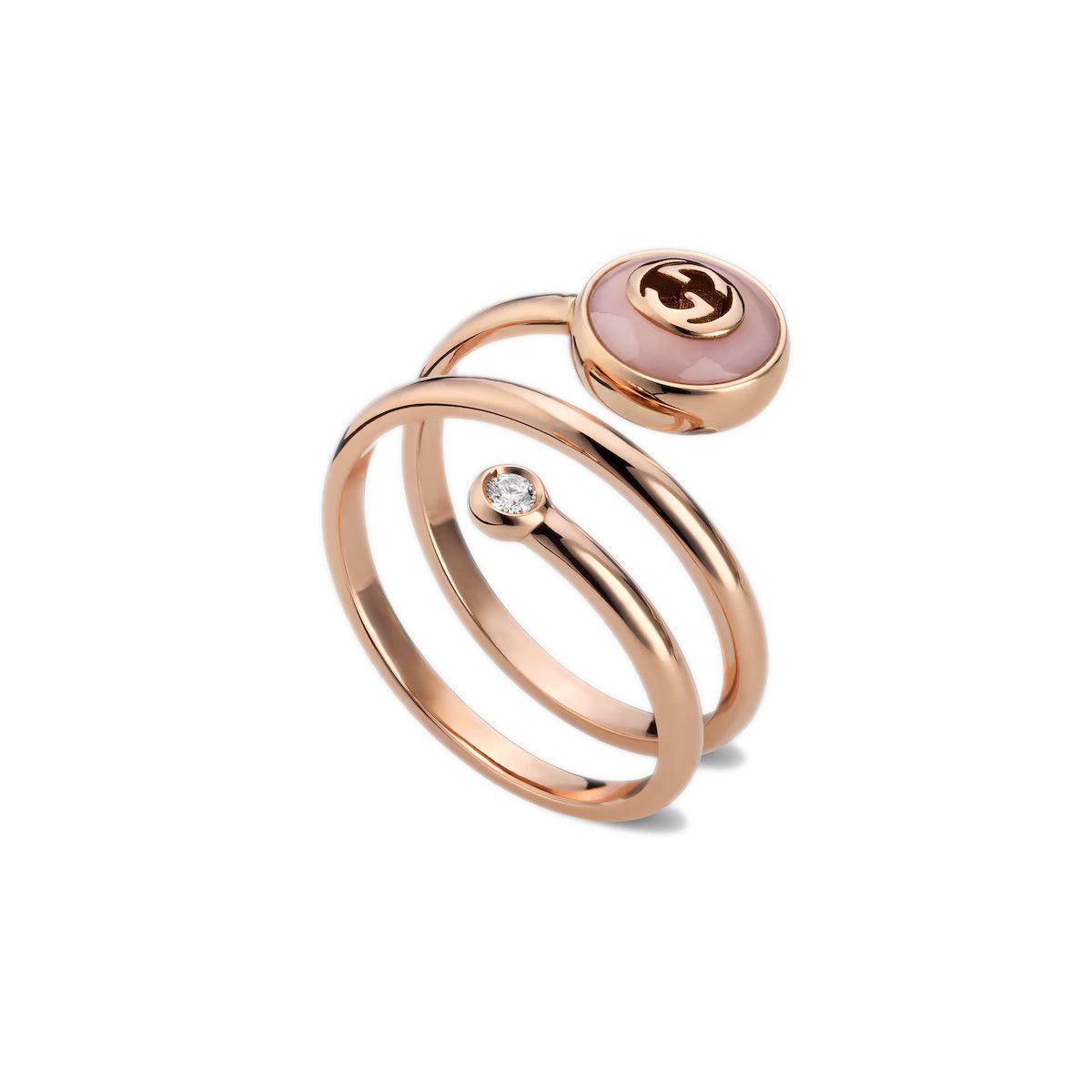 La nuova linea Gucci Interlocking presenta l'opale rosa, una pietra preziosa nota per le sue proprietà rilassanti. I nuovi modelli in oro rosa sfoggiano la gemma insieme ai diamanti bianchi, come questo anello a spirale.