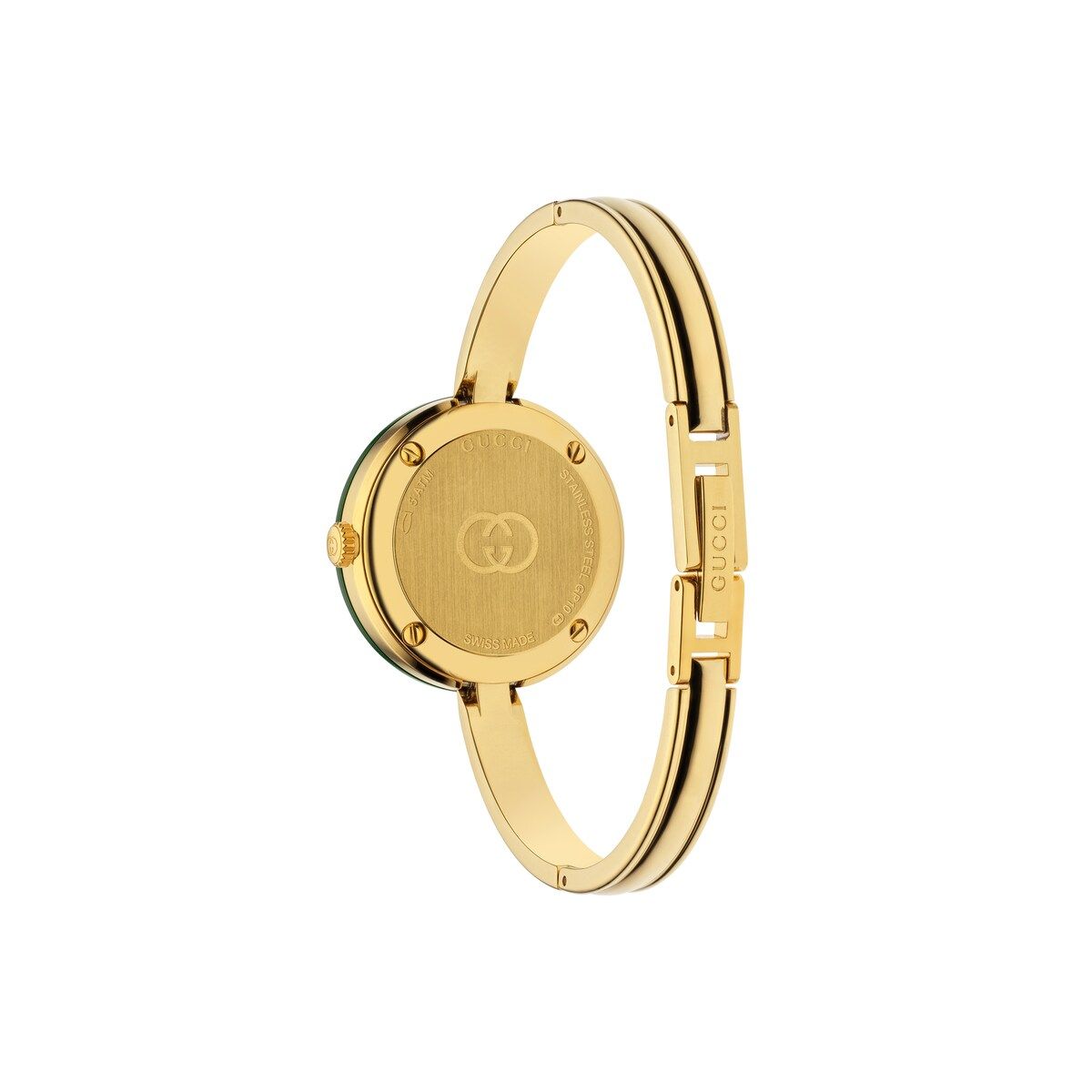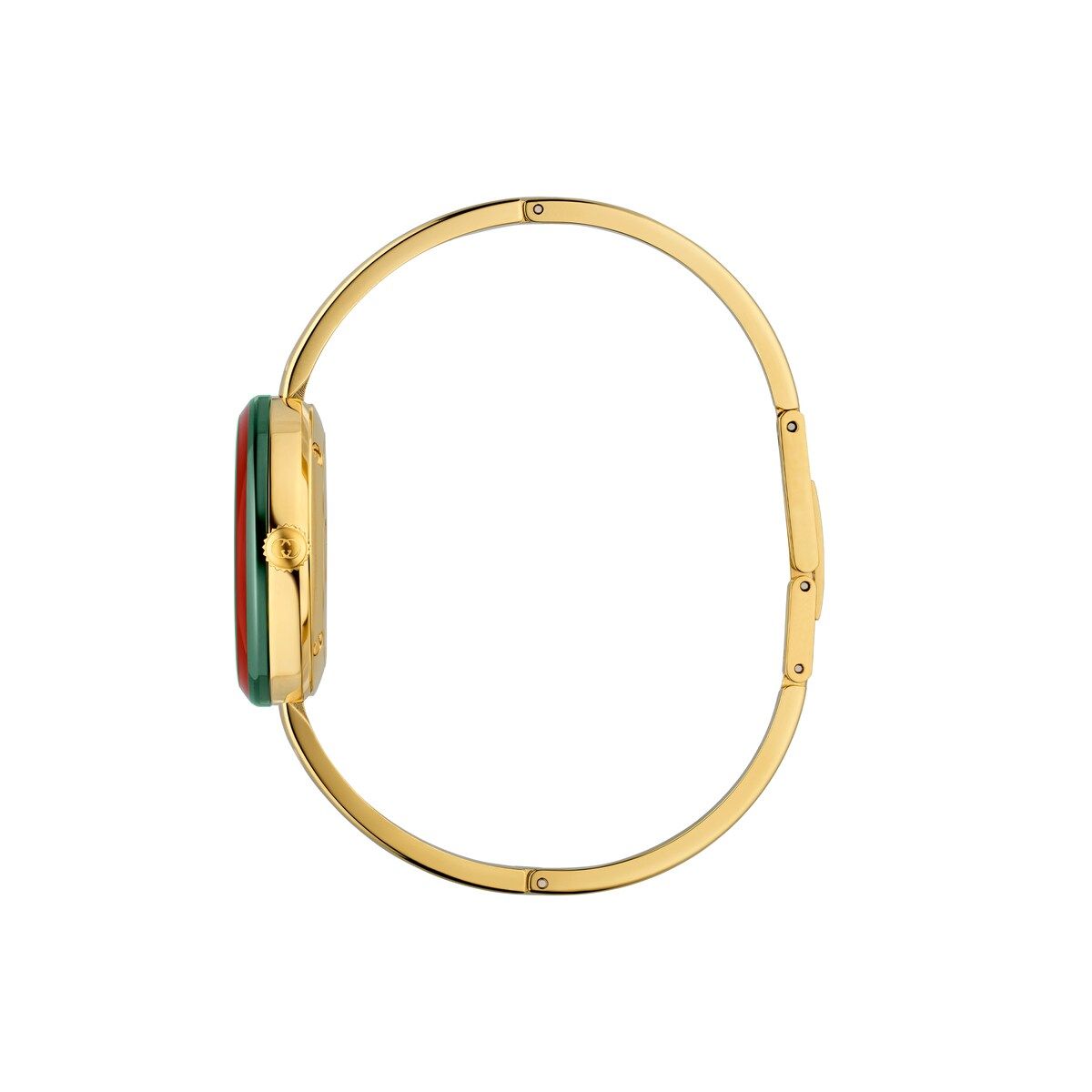 La collezione di orologi Gucci Play presenta una silhouette essenziale caratterizzata da lunette intercambiabili in ceramica, per un'ampia versatilità di stile. Alimentato da un movimento al quarzo, questo accessorio è definito da un bracciale in stile bangle color oro e da un quadrante bianco impreziosito dai simboli emblematici.