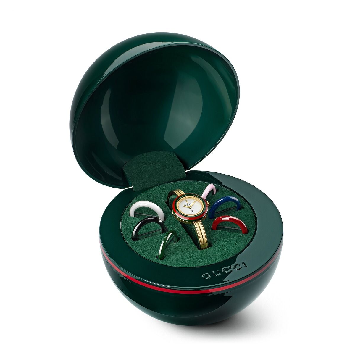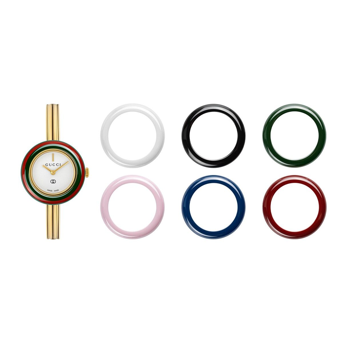 Quadrante: bianco con logo Gucci e dettaglio Incrocio GG, con 7 lunette intercambiabili in ceramica
