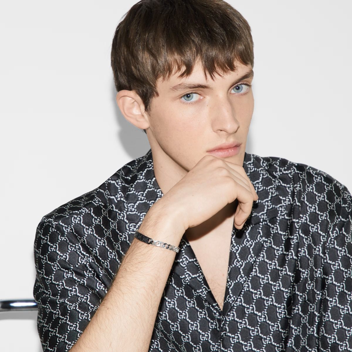 Gucci fa rivivere il suo logo trademark su targhette ovali in argento e smalto, richiamando le collane e i bracciali con targhette degli anni '90 con un tocco raffinato. Le varianti in gomma con motivo GG offrono un'alternativa alla linea di gioielli da indossare tutti i giorni.