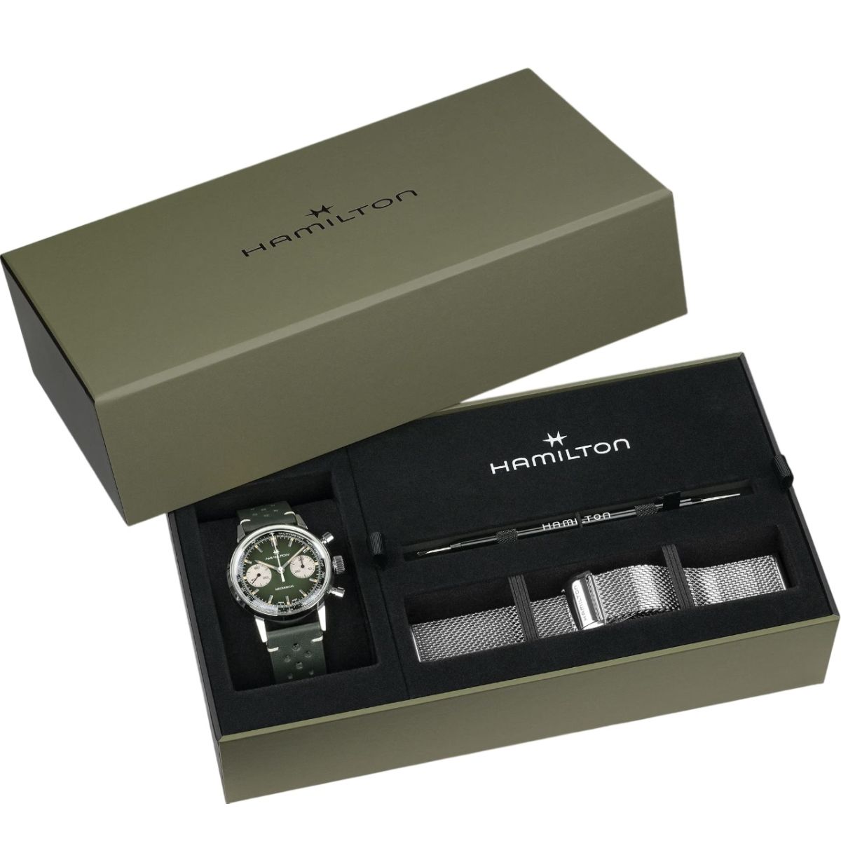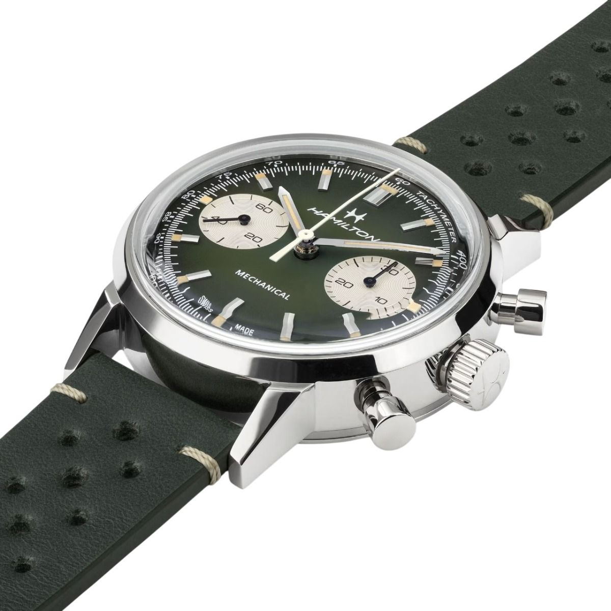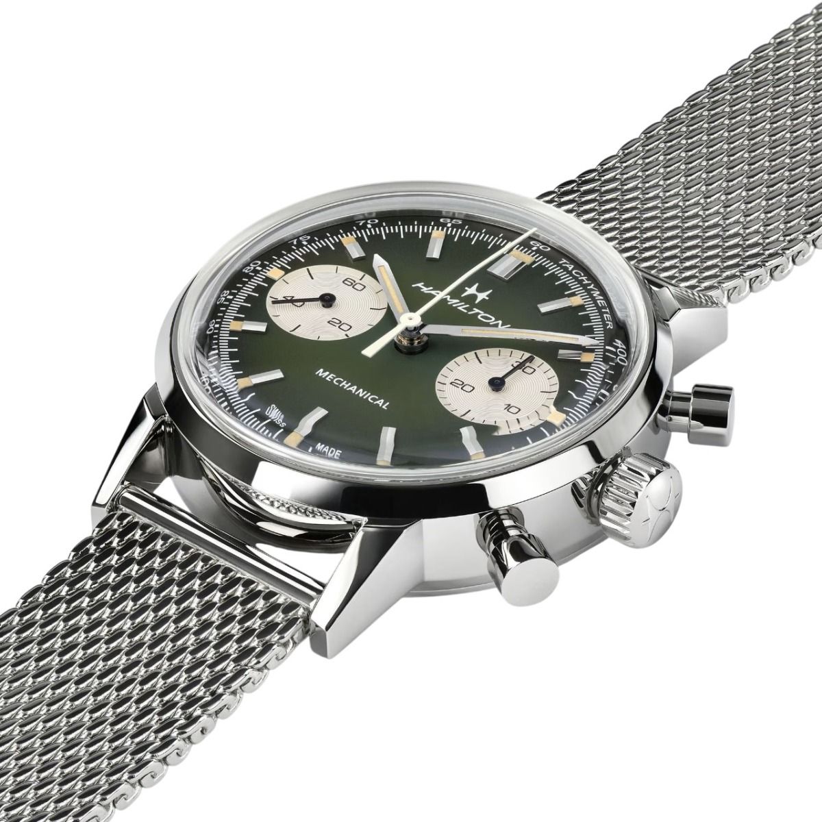 L’American Classic Chronograph 40 mm in verde intenso interpreta in chiave contemporanea l’estetica delle corse automobilistiche vintage. La finitura fumé aggiunge profondità alla tonalità intensa del quadrante, mentre il cinturino traforato rende omaggio al design classico del motorsport. Corredato da un secondo versatile bracciale in maglia fornito nella confezione, questo cronografo automatico unisce lo spirito pionieristico di Hamilton a un look pronto per la corsia di sorpasso.