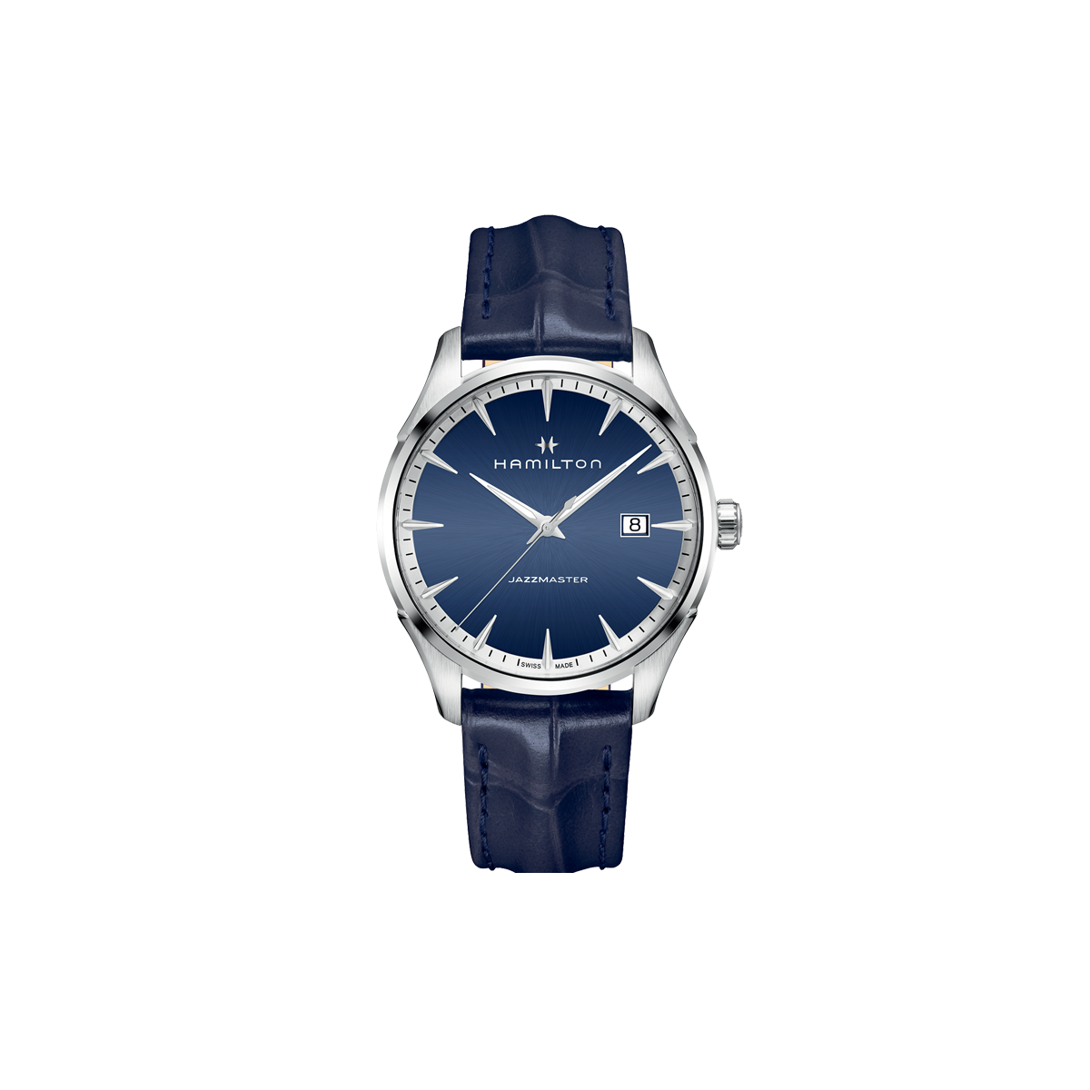 L'orologio Jazzmaster Gent è dotato di un movimento al quarzo. La cassa è in acciaio inossidabile. Il quadrante blu soleil presenta le lancette e gli indici argentati con rivestimento SuperLuminova e la finestrella del datario a ore 3.
