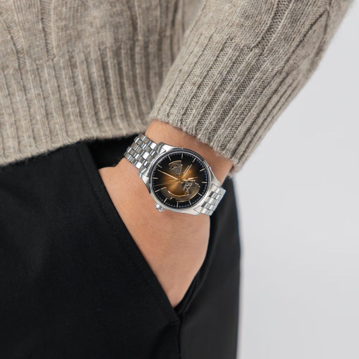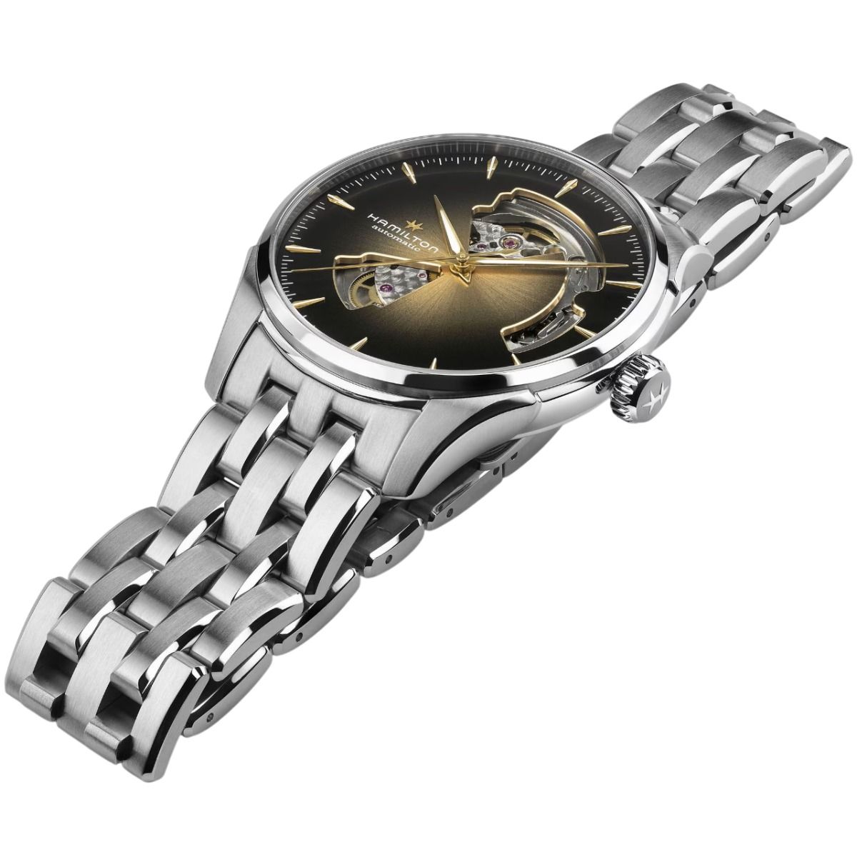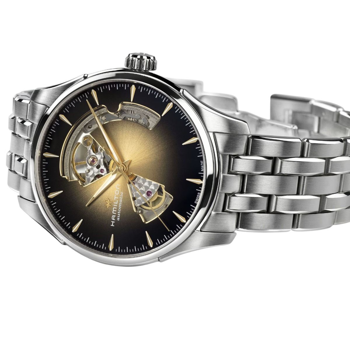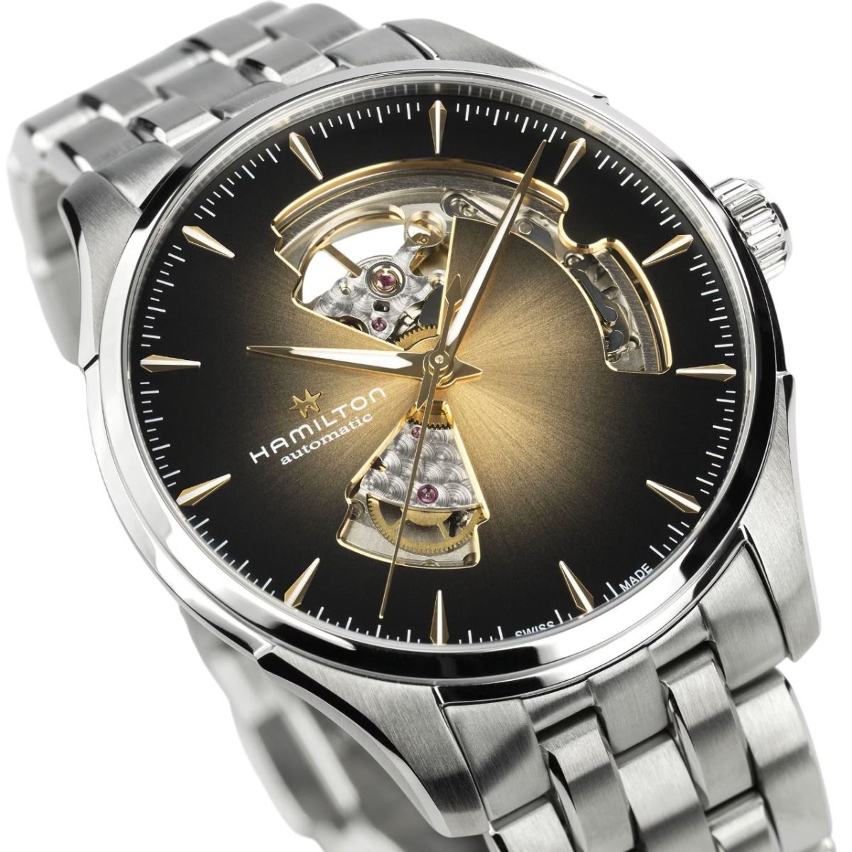 Hamilton Jazzmaster Open Heart Auto / orologio uomo / quadrante scheletrato nero con sfumatura dorata / cassa e bracciale acciaio