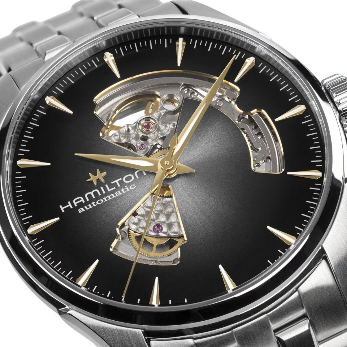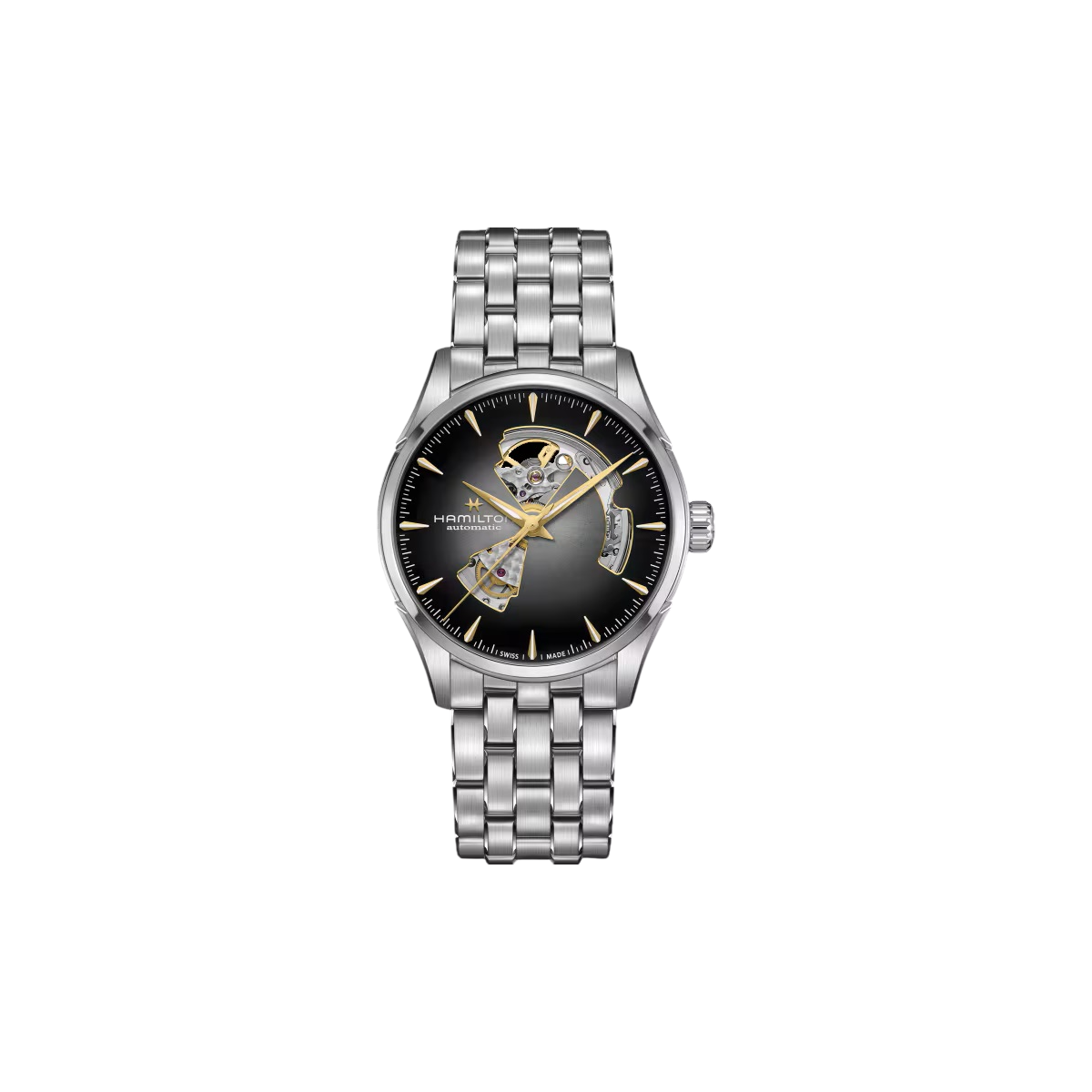 Hamilton Jazzmaster Open Heart Auto / orologio uomo / quadrante scheletrato nero / cassa e bracciale acciaio