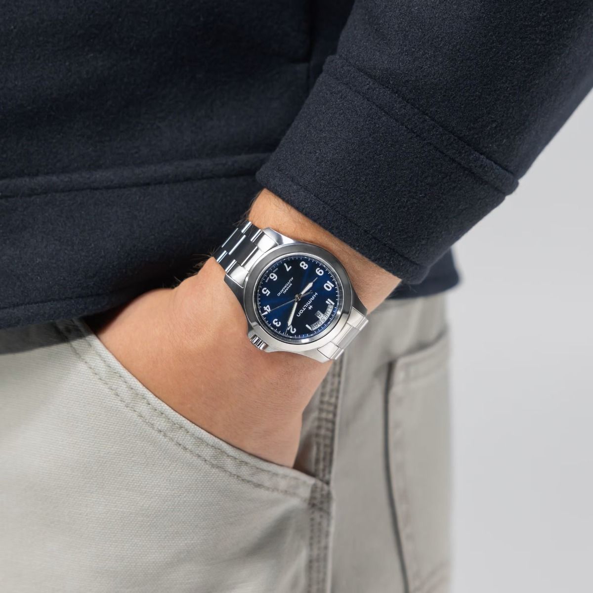 Robusto ma raffinato, il Khaki Field King 40 mm reinterpreta un’icona militare pensata per il tempo libero. Il quadrante blu spazzolato con finitura soleil presenta numeri arabi ben definiti e la caratteristica indicazione del giorno e della data a ore 12, incorniciati da una cassa e un bracciale in acciaio spazzolato con regolazione EasyClick. Con un’impermeabilità fino a 10 bar e dotato di un vetro zaffiro antiriflesso, questo orologio militare garantisce una resistenza superiore e massima leggibilità all’aperto in ogni condizione. Un classico moderno pensato per il tempo libero, con un’anima tradizionale.