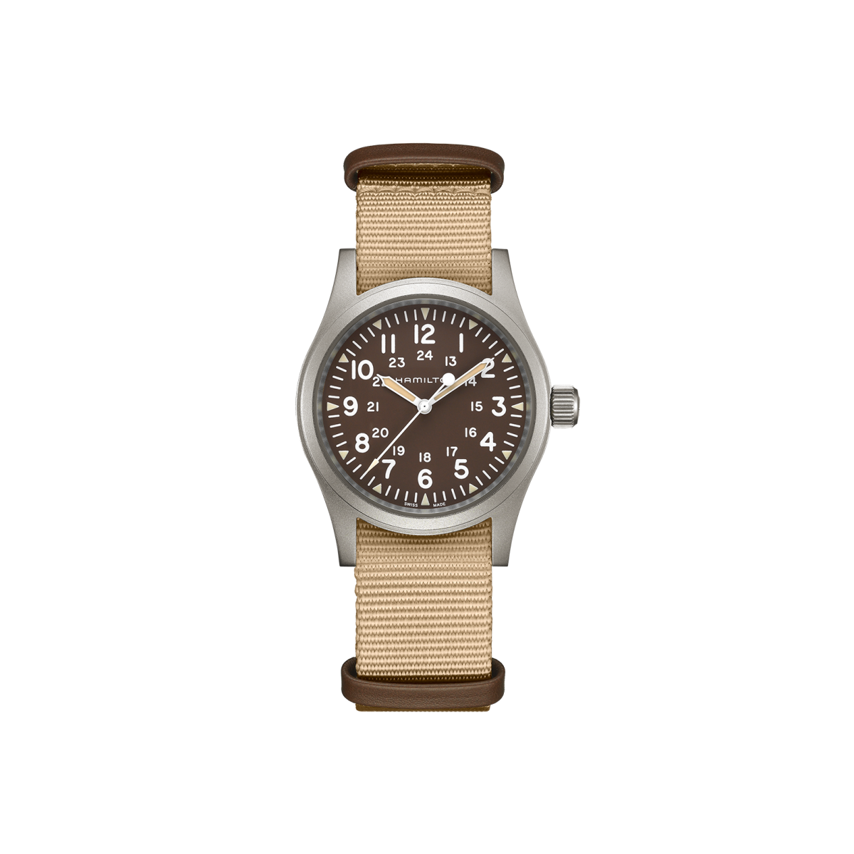Hamilton Khaki Field Mechanical / orologio uomo / quadrante marrone / cassa in acciaio / cinturino NATO beige e pelle marrone