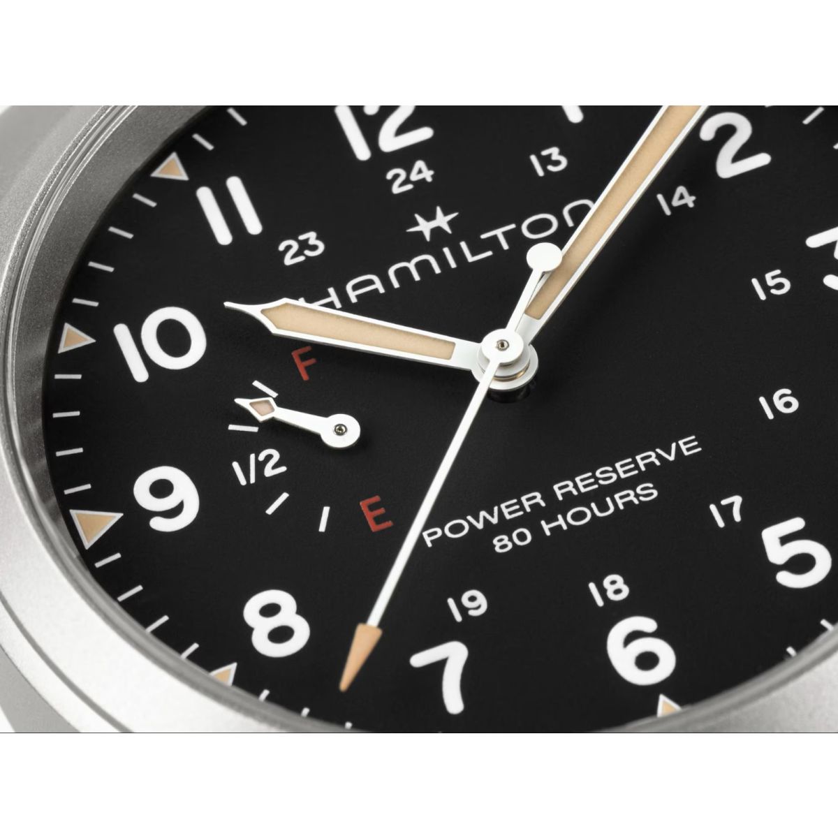 Il Khaki Field Mechanical Power Reserve 40 mm rende omaggio al design tradizionale e alla funzionalità essenziale della famiglia Khaki, introducendo al contempo caratteristiche moderne e le ultime novità in fatto di tecnologia e innovazione orologiere. Dotato di un nuovo movimento a carica manuale H-23, sviluppato da ETA in esclusiva per Hamilton, consente per la prima volta di visualizzare direttamente sul quadrante la riserva di carica di 80 ore. Dotato di un bracciale in acciaio, il quadrante nero mostra le diciture “power reserve 80 hours” (“riserva di carica di 80 ore”), “F” (completamente carico) ed “E” (scarico), sottolineando questa caratteristica funzionale d’eccezione.