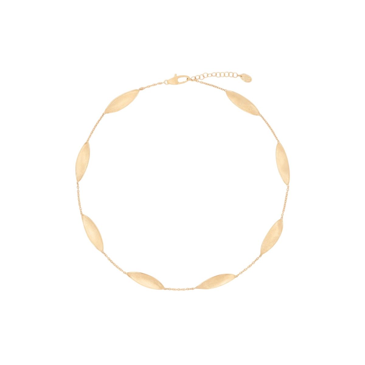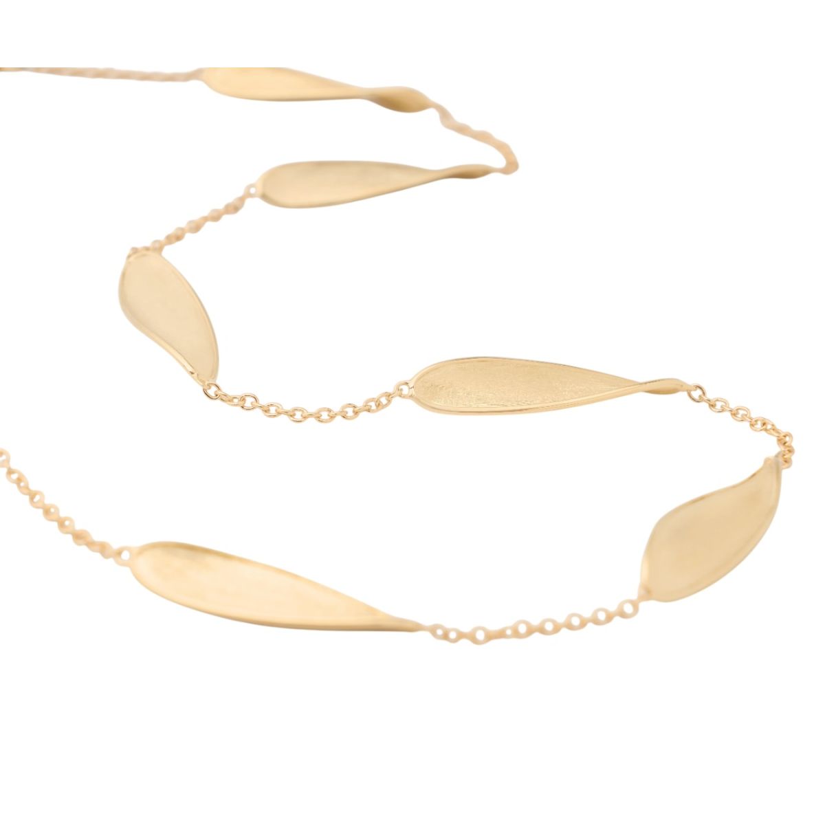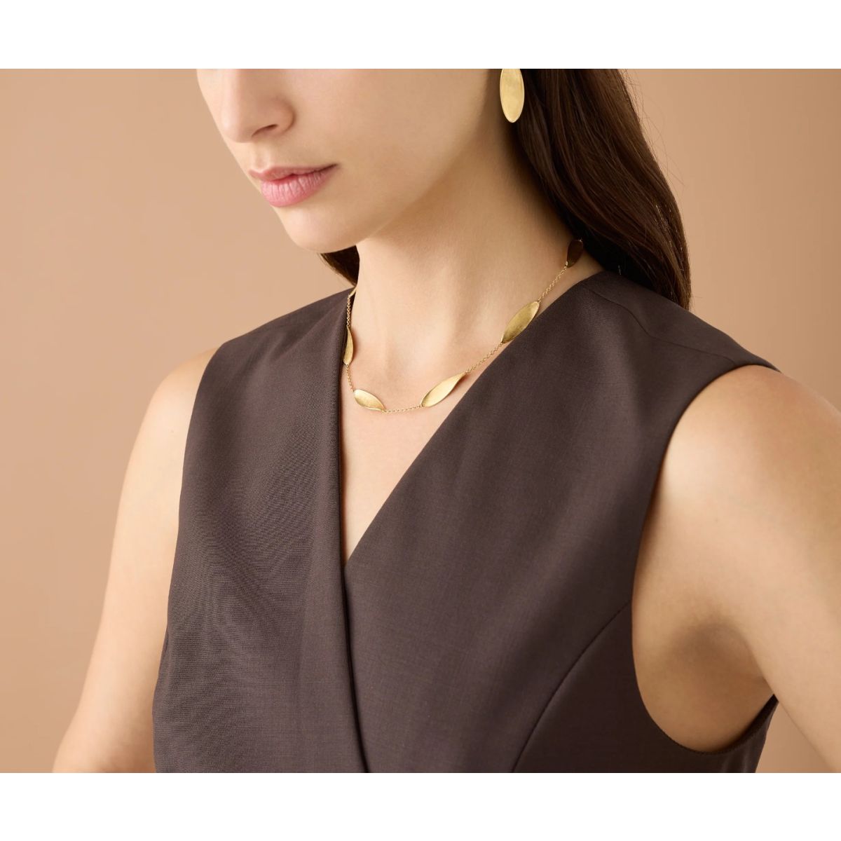 L'iconico motivo a foglia rivisitato con un tocco raffinato. Questa collana presenta una sequenza regolare di foglie leggere in oro giallo 18 kt, delicatamente intrecciate per creare una silhouette fluida e scultorea. Alternato a una sottile catena, ogni elemento è finemente inciso a mano secondo l'antica tecnica fiorentina. Questa collana presenta una catena regolabile, che offre una vestibilità personalizzabile per ogni scollatura.