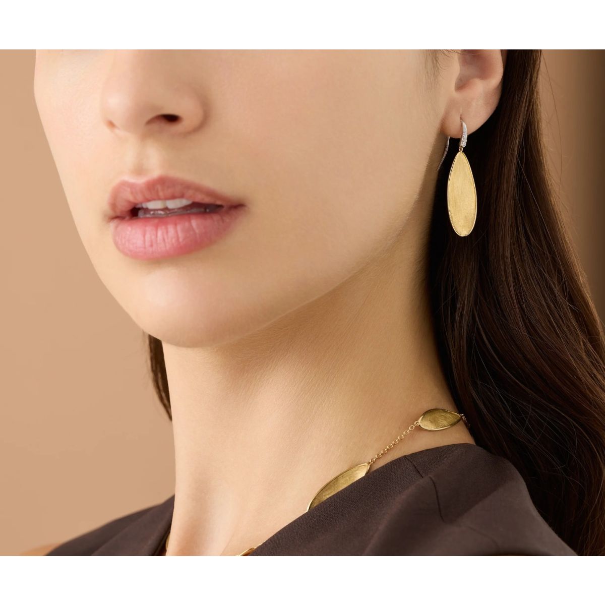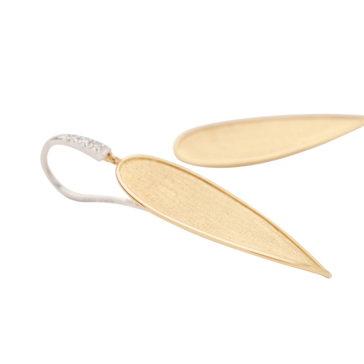 L'iconico motivo a foglia rivisitato con un tocco raffinato. Questi orecchini pendenti dalla forma irregolare sono finemente incisi a mano secondo l'antica tecnica fiorentina. Le foglie in oro giallo 18 carati, delicatamente intrecciate per creare una silhouette fluida e scultorea, sono impreziosite da un delicato gancio in pavé di diamanti.