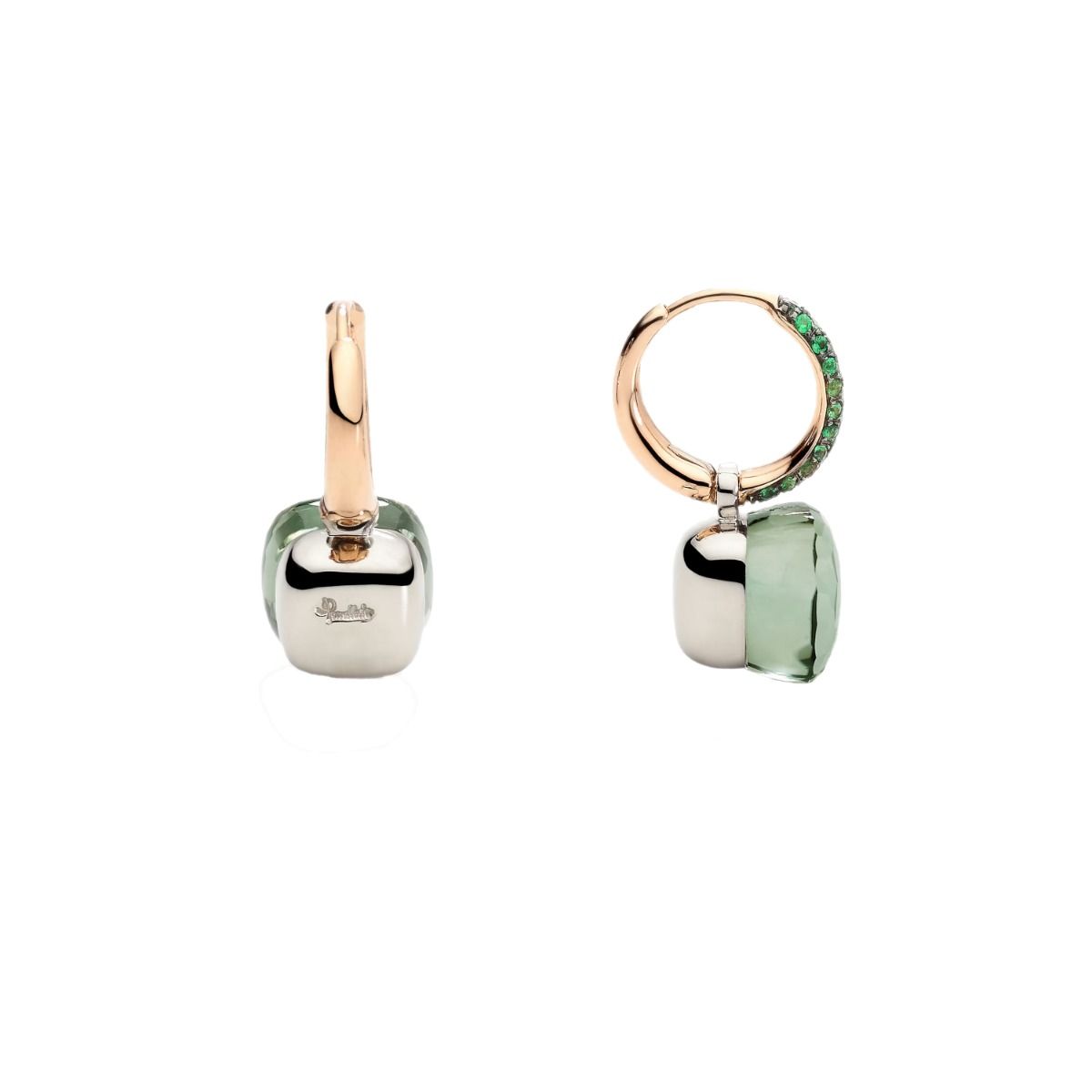 Icona indiscussa dello stile Pomellato, Nudo continua a distinguersi per la magia dei suoi colori. Gli orecchini con doppietta di prasiolite e malachite abbinata a un pavé di tsavoriti propongono una combinazione inedita di gemme trasparenti e pietre dure.