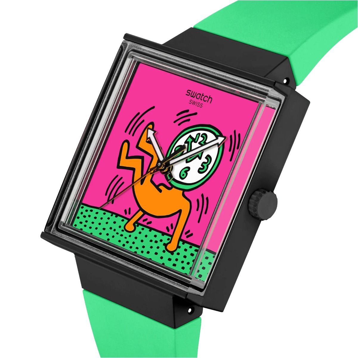La cassa quadrata nero opaco del BIOCERAMIC è dotata di un vetro biosourced edge-to-edge con vista da ogni angolatura per l'artwork multicolore stampato sul quadrante. Il quadrante quadrato multicolore presenta lancette nere fosforescenti a forma di freccia per le ore e i minuti e una lancetta nera per i secondi. Il quadrante e la cassa sono completati da un cinturino integrato verde chiaro opaco biosourced con un passante nero opaco sempre biosourced e una fibbia BIOCERAMIC abbinata. Il coperchio della batteria bianco opaco con stampa multicolore sul retro raffigura il logo Swatch creato da Keith Haring.
