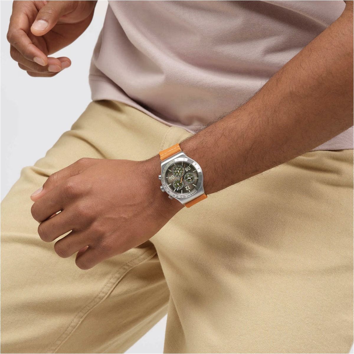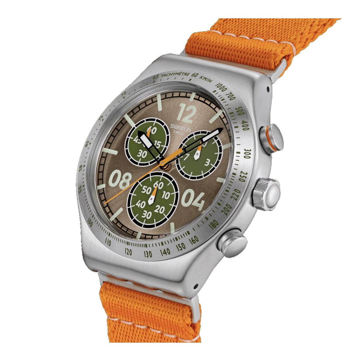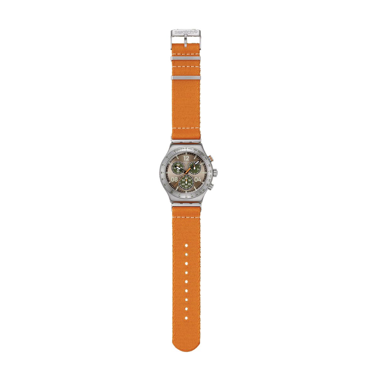 Swatch / Irony Chrono / Vacation Time / orologio unisex / quadrante marrone / cassa acciaio / cinturino in tessuto