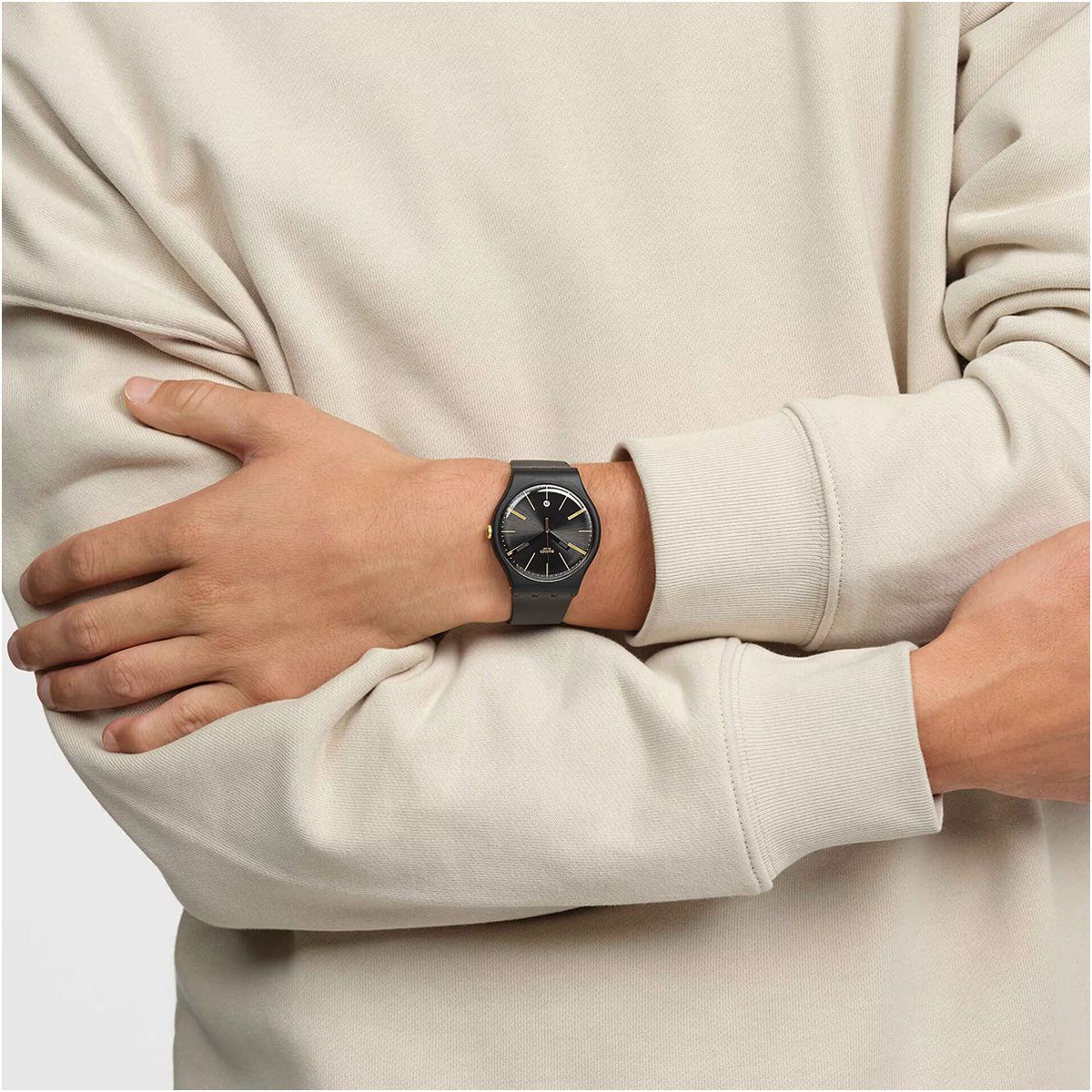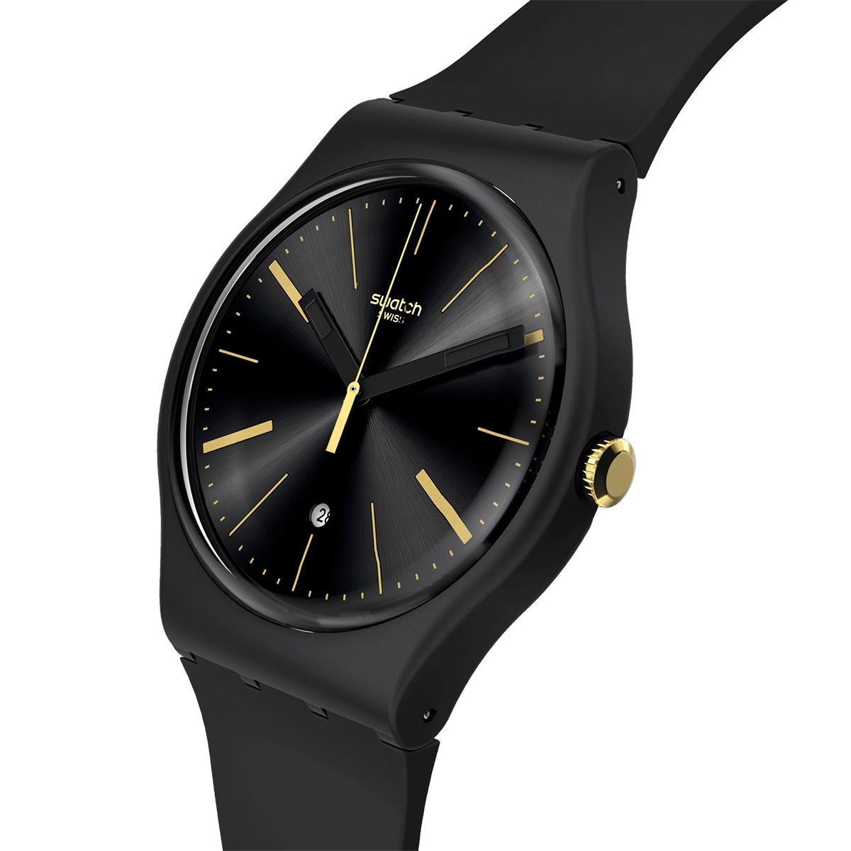 Swatch A Dash of Yellow / Skin Irony / orologio unisex / quadrante nero / cassa plastica / cinturino gomma