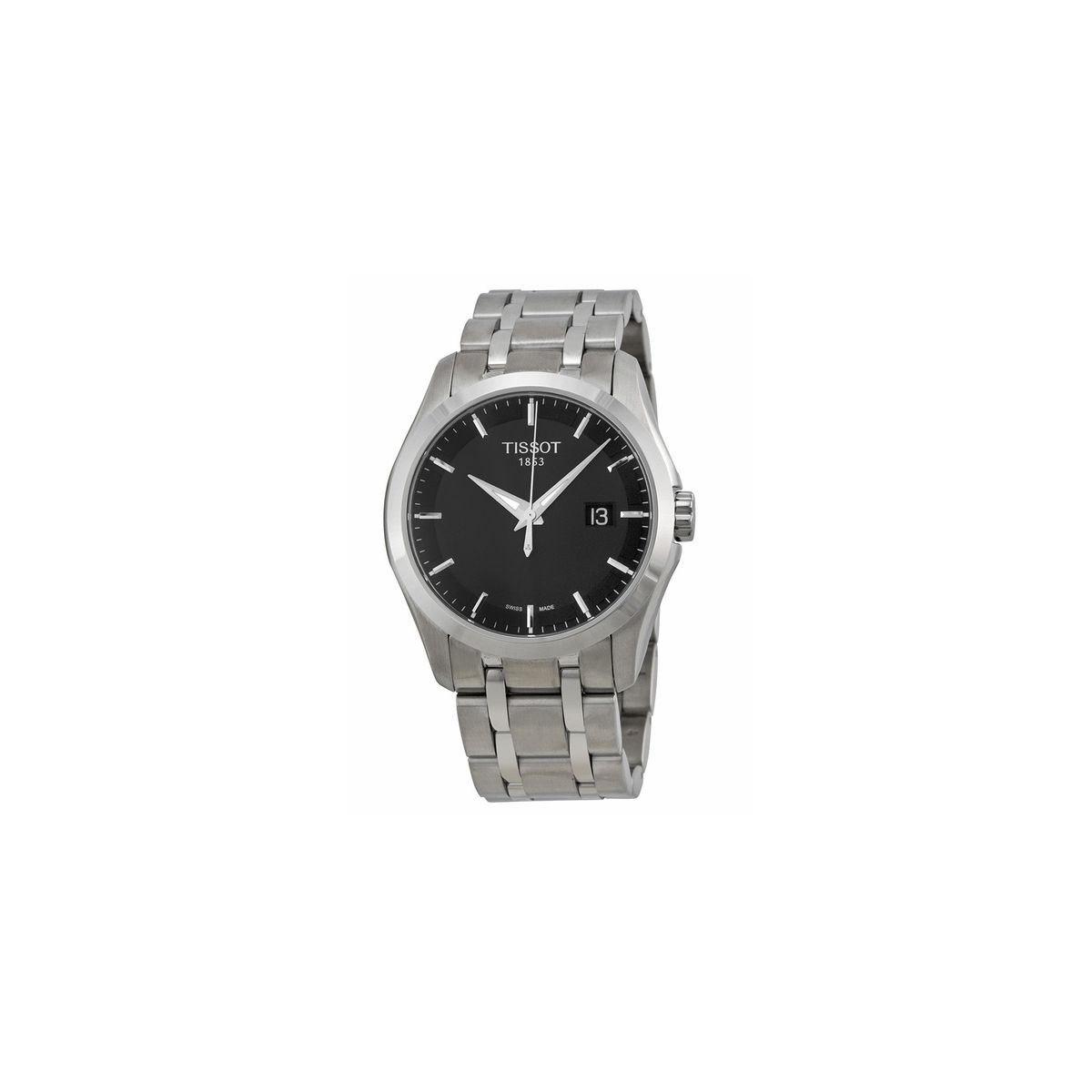 L’orologio Tissot Couturier è dotato di un movimento al quarzo con indicatore di fine carica della batteria (EOL). Lo spessore della cassa in acciaio è di 10,45 mm. Il quadrante nero presenta le lancette e gli indici argentati, la finestrella del datario a ore 3.