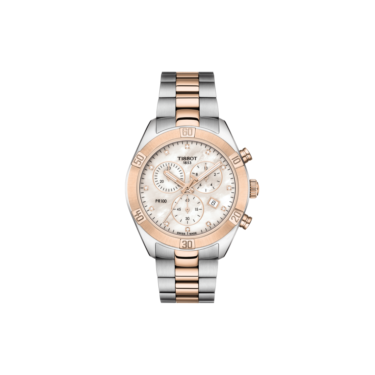 Tissot PR100 Sport Chic Chronograph Lady / orologio donna / quadrante madreperla bianca / cassa e bracciale acciaio e PVD rosato