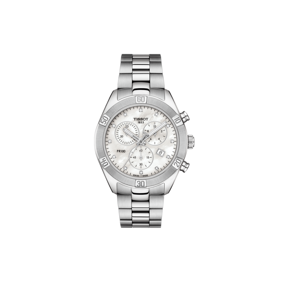 Tissot PR100 Sport Chic Chronograph Lady / orologio donna / quadrante madreperla bianca / cassa e bracciale acciaio
