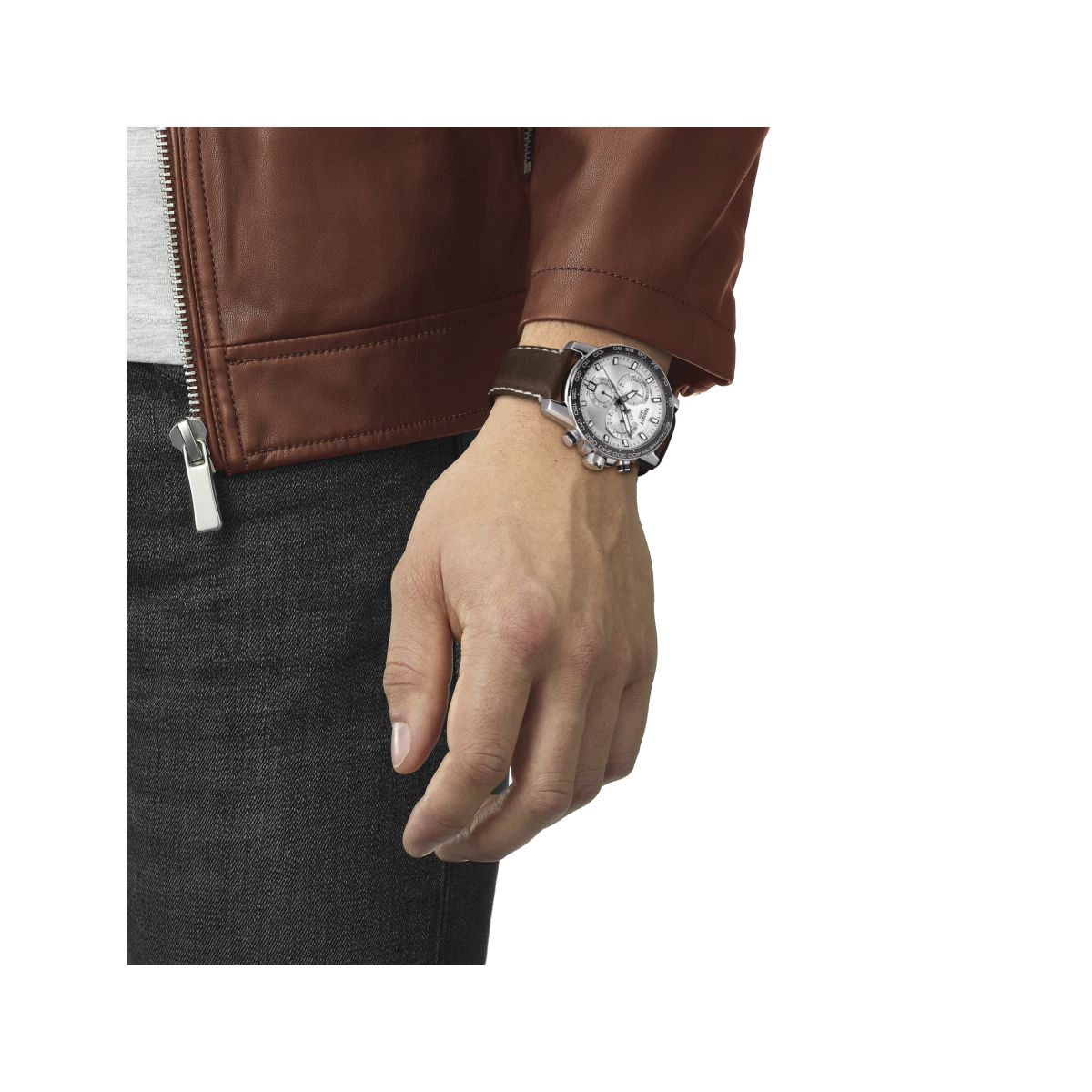 Per conferire un aspetto sportivo e di tendenza a questo cronografo svizzero, l'orologio ha un cinturino in pelle marrone cucito a mano con impunture bianche effetto vintage.